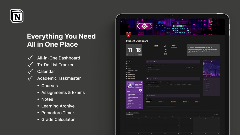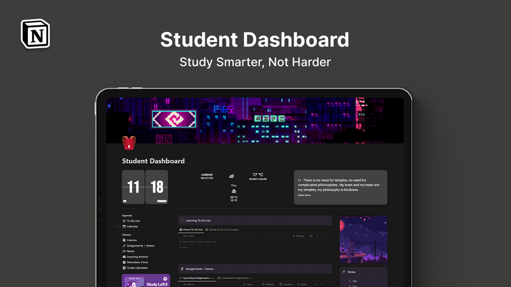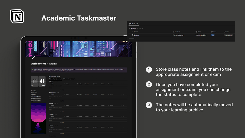 The template conveniently allows you to monitor upcoming assignments and exams, while also providing a platform to write, organize and access your notes directly from Notion.